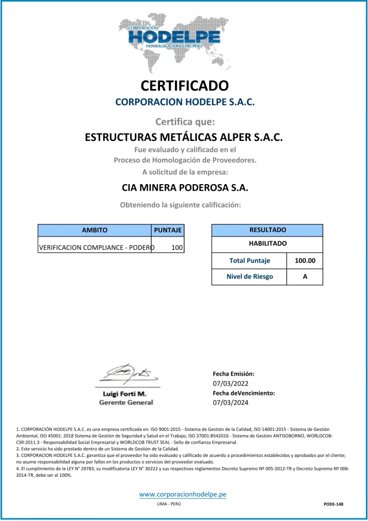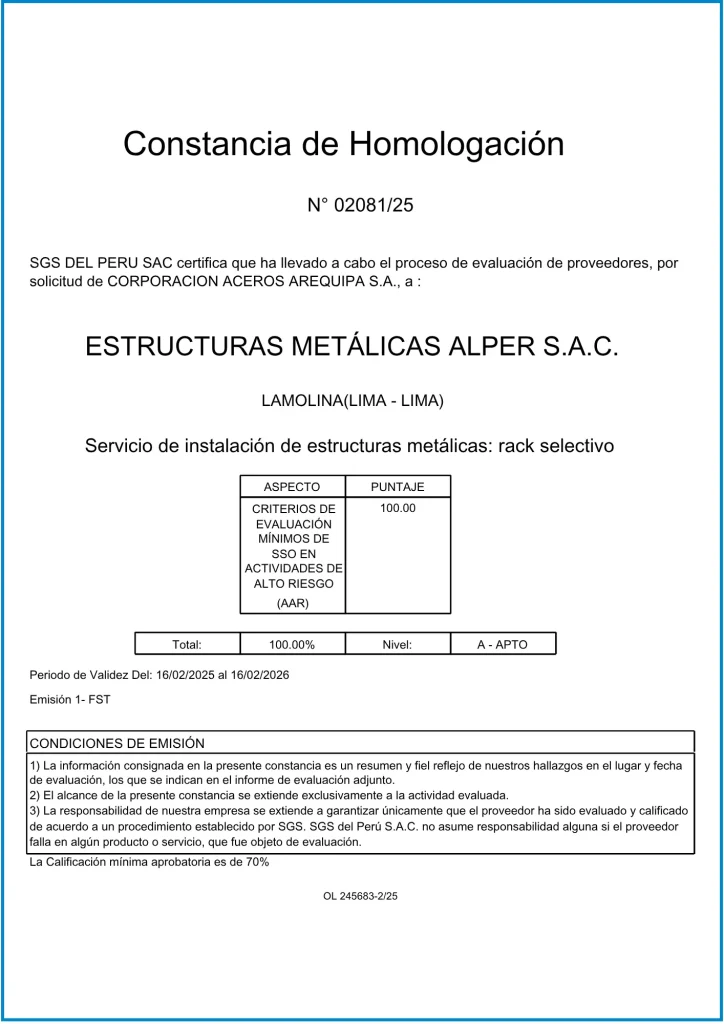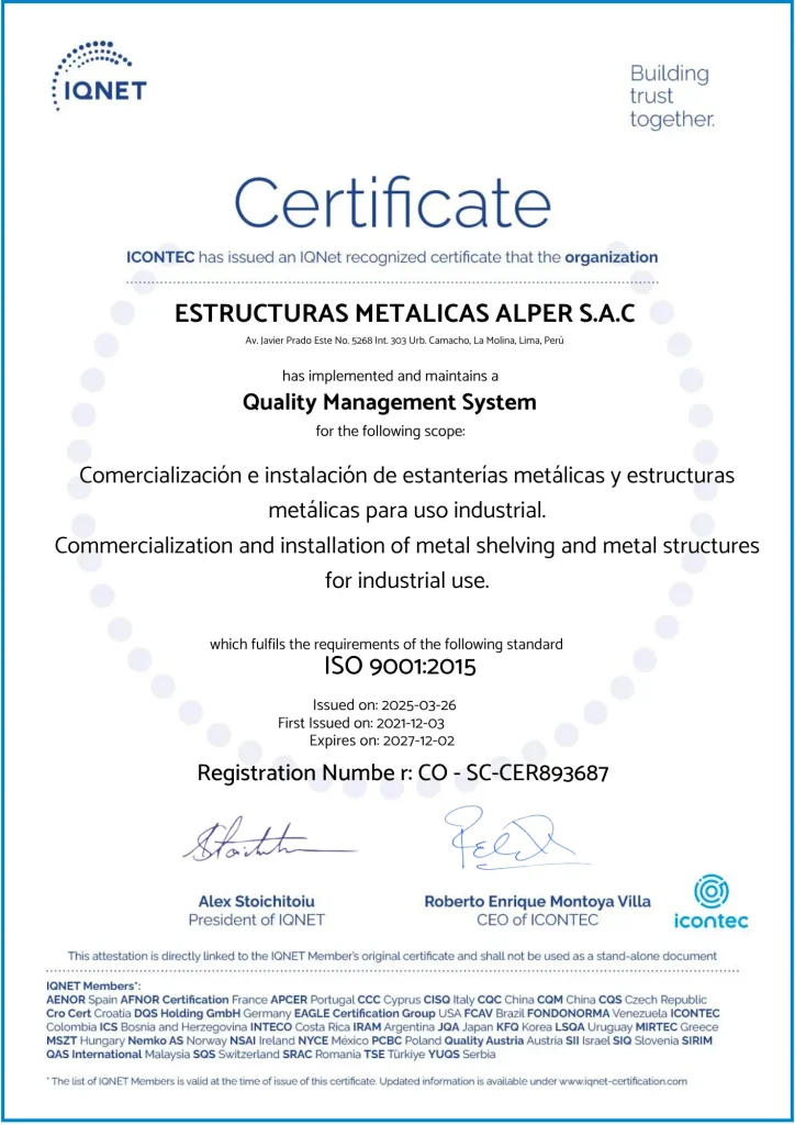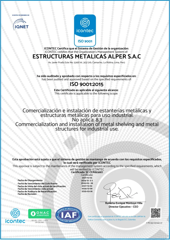 Estanterías metálicas ALPER cumple con normas y certificaciones para la producción y comercialización de productos acabados en estanterías metálicas. Nuestros procesos de adaptan a la norma técnica vigente, asegurando un debido control de calidad para la entrega de nuestros servicios y proyectos. Contamos con socios estratégicos para la producción y ejecución de proyectos a nivel nacional.